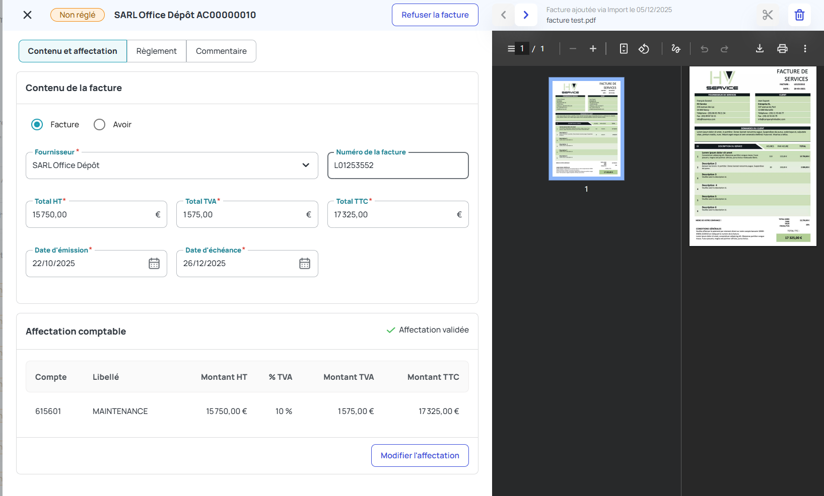 Lorsque vous importez une facture d’achat dans MEG, le logiciel identifie automatiquement les données du fournisseur. Si un modèle d’affectation comptable a déjà été défini pour ce fournisseur, MEG pré-remplit les champs nécessaires : compte comptable, libellé, montant HT et TVA.