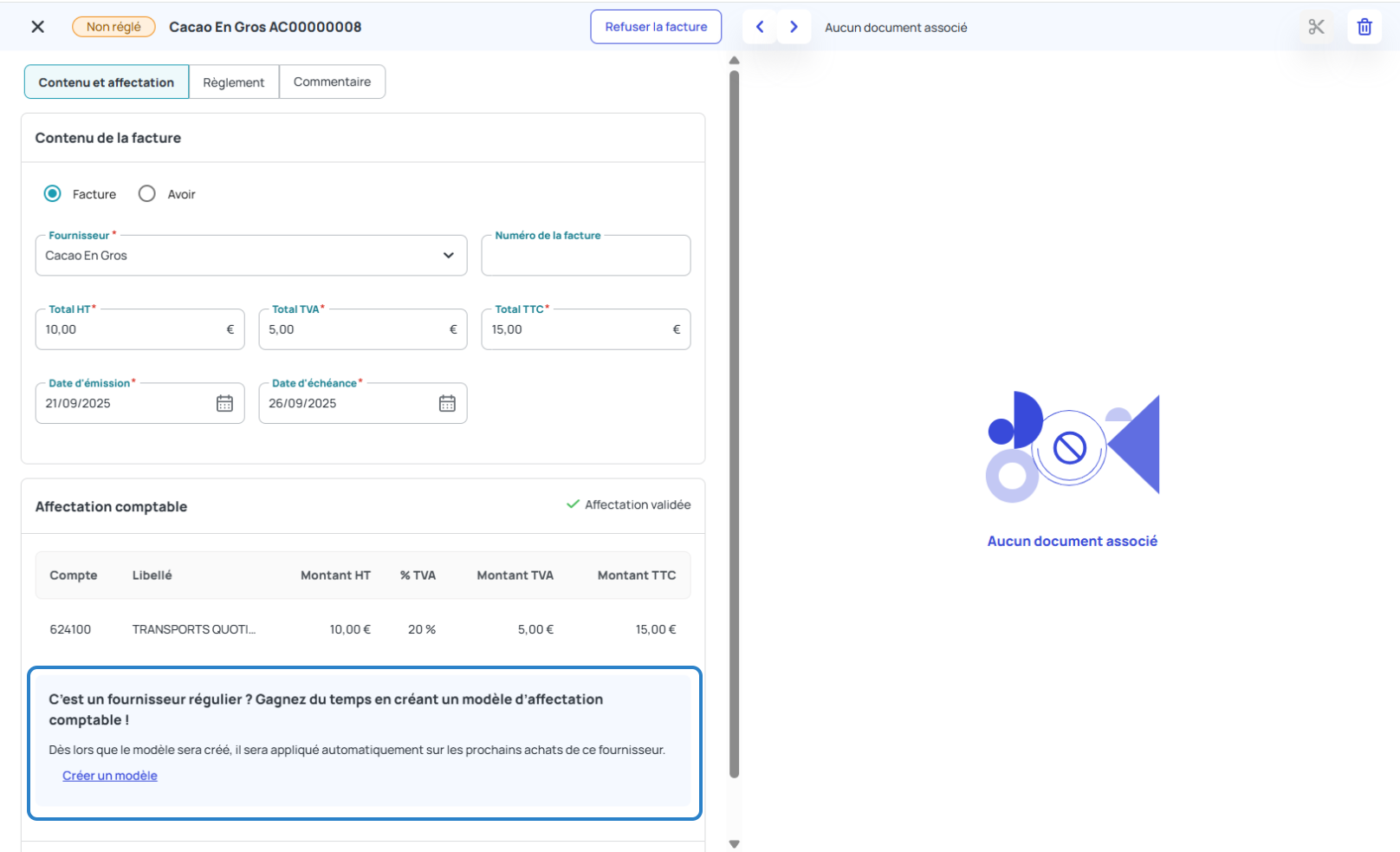 Une fois le modèle paramétré, il s’appliquera également aux achats déjà enregistrés, à condition que ceux-ci n’aient pas encore d’affectation validée.
