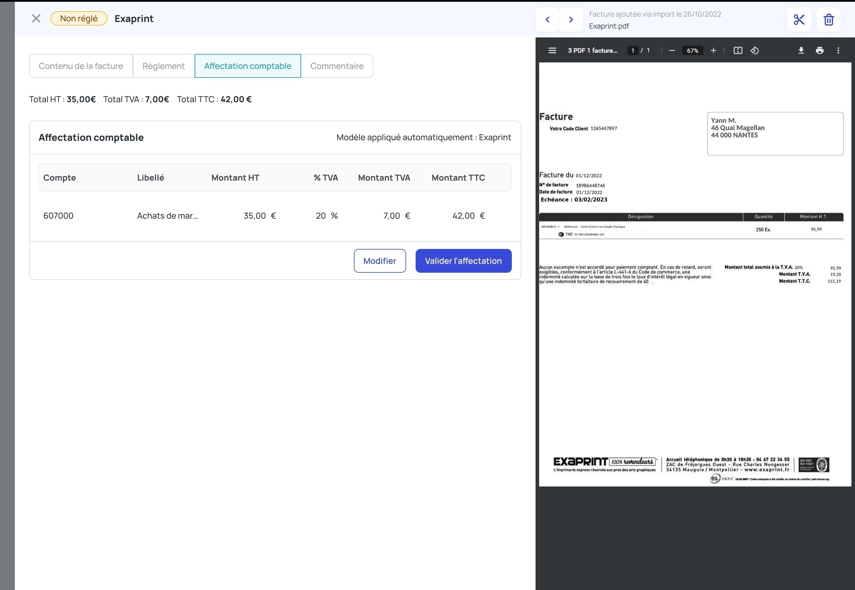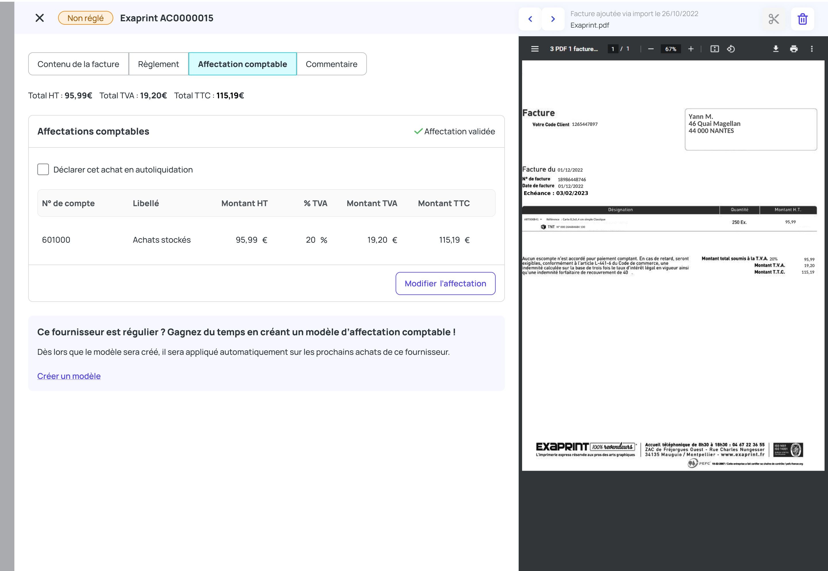 Une fois le modèle paramétré, il s’appliquera également aux achats déjà enregistrés, à condition que ceux-ci n’aient pas encore d’affectation validée.
