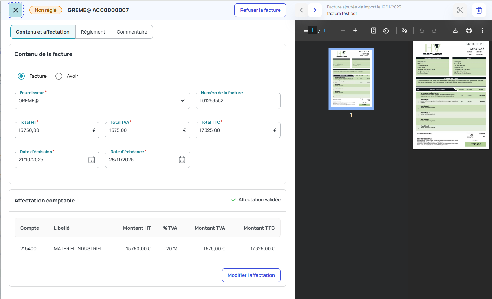 - Renseignez le montant, l'affectation et la facture correspondante.