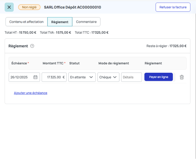 Vous pouvez diviser le paiement en plusieurs échéances en cliquant sur “Ajouter une échéance”, à condition que la somme des montants TTC soit égale au montant total de la facture. La nouvelle échéance se crée automatiquement avec une date fixée à 30 jours après la dernière échéance et un montant calculé selon le solde restant.