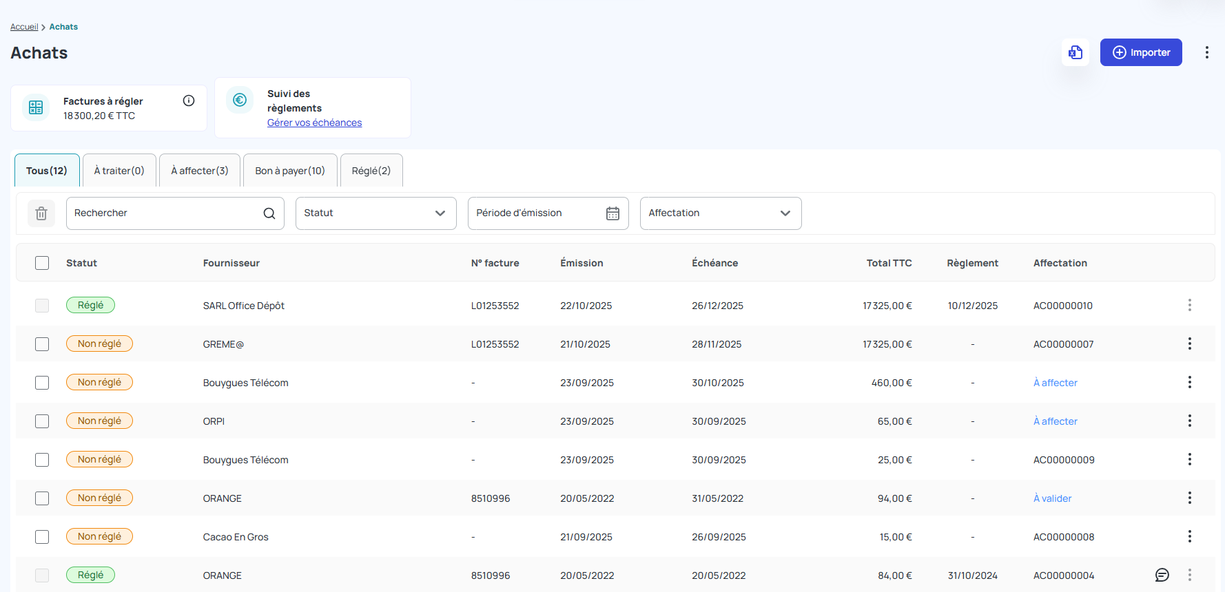 L'onglet "Règlement" est disponible depuis le sous-menu Achats, depuis la Home sur le widget "Vous devez à vos fournisseurs", sur le lien "Gérer vos échéances" depuis la liste des achats.