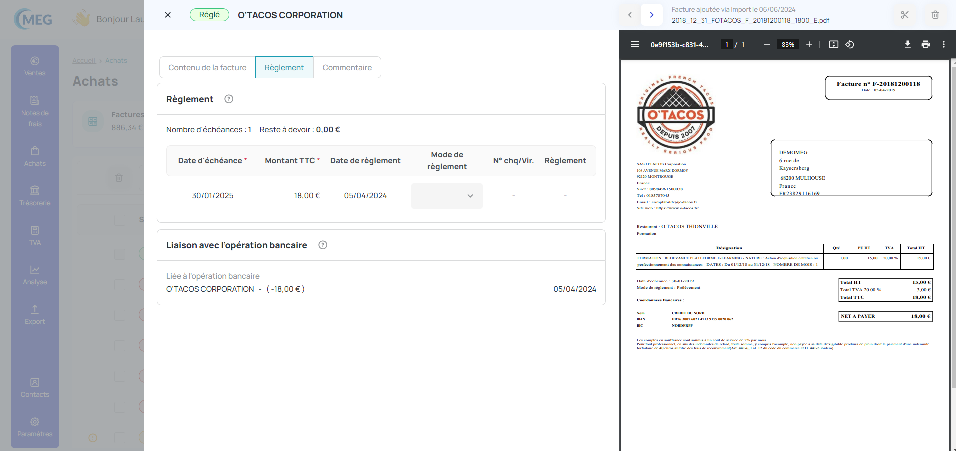 Si vous ne passez pas par Libeo, vous devez attendre que le paiement apparaisse dans votre relevé bancaire pour que la facture passe automatiquement au statut RÉGLÉ.