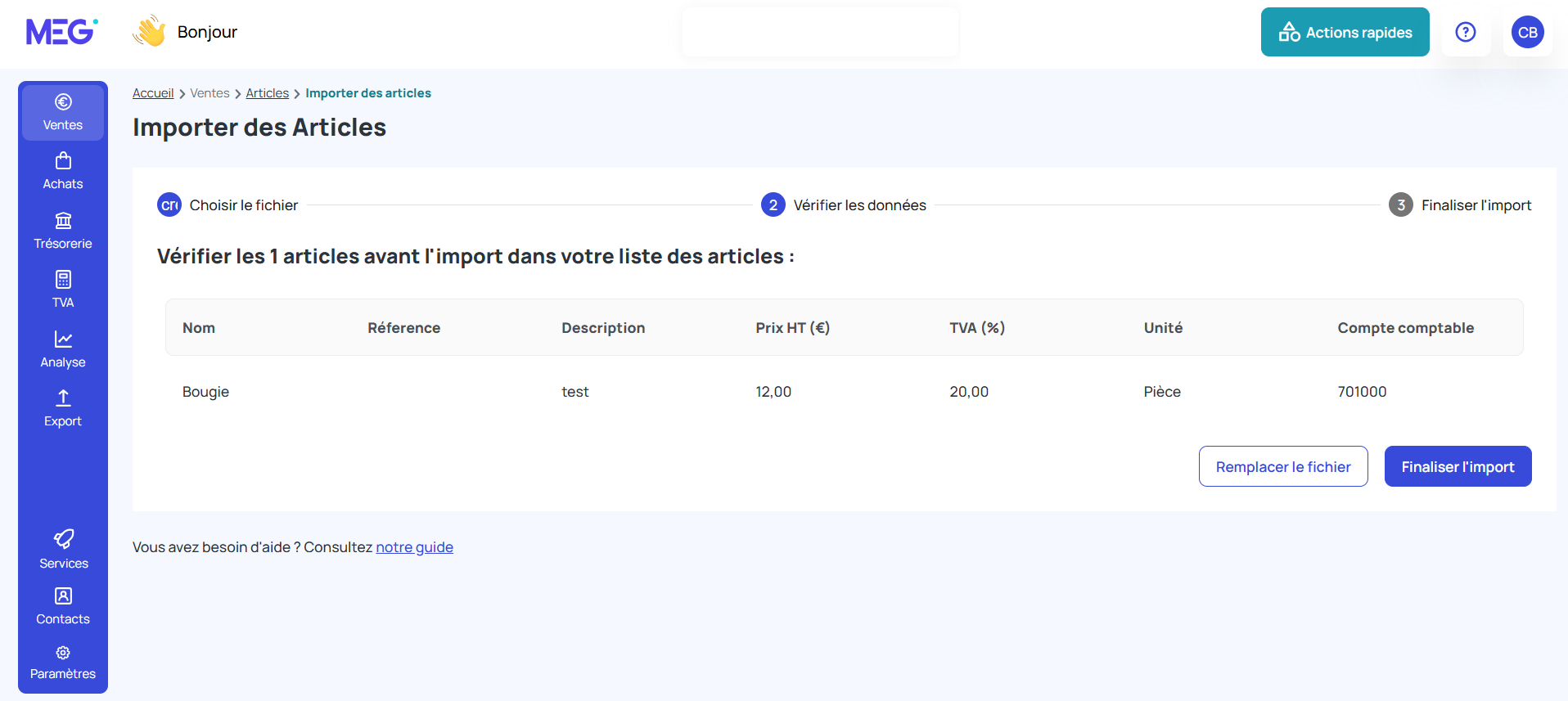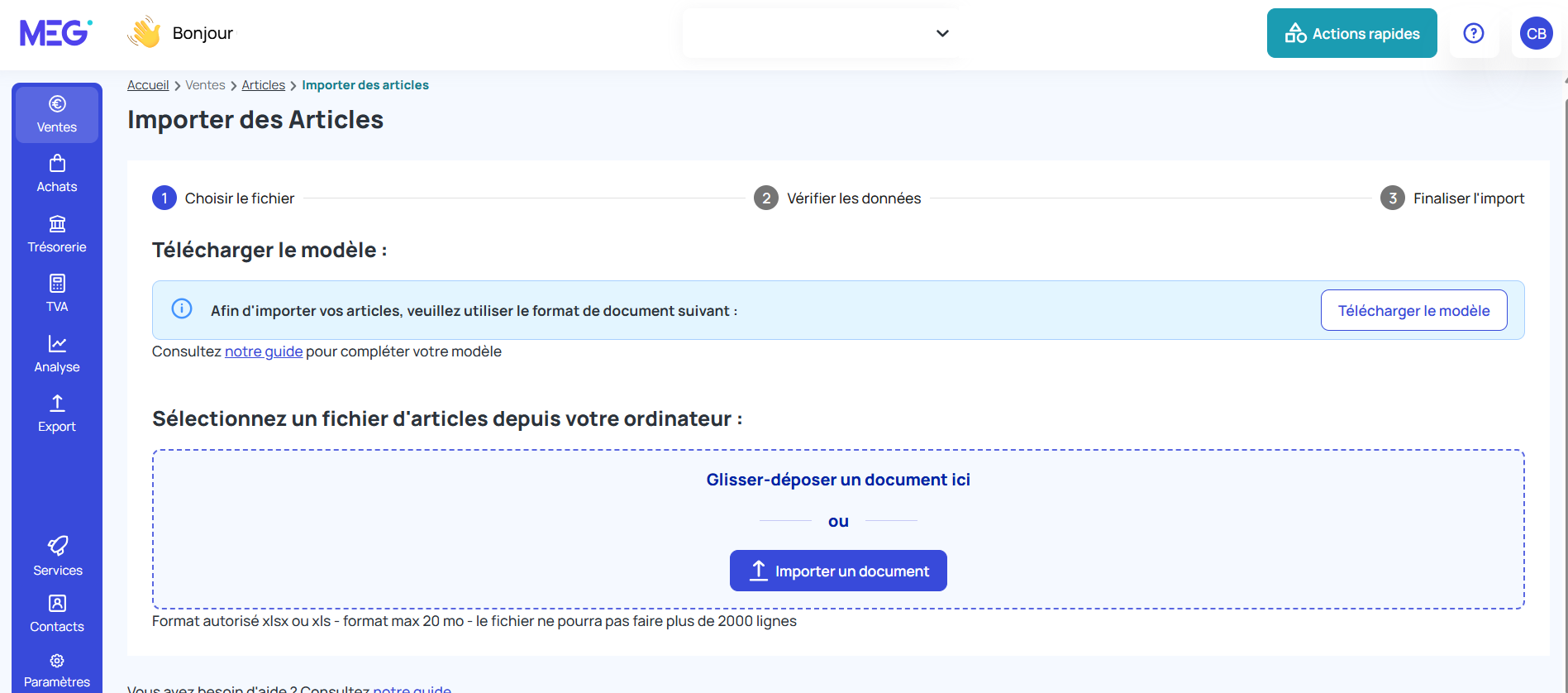 Important Téléchargez le modèle pour respecter le format demandé et que tout se déroule parfaitement. Format : Nom, référence, description, Prix HT, TVA, Unité, Compte comptable