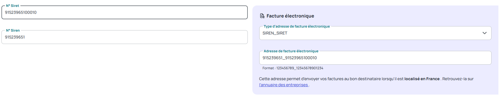 Attention Cette adresse figurera ensuite sur votre facture. Quand la réforme entrera en vigueur, les clients personnes morales n'ayant pas cette adresse renseignée ne pourront plus valider les factures qui auront le statut "erreur".