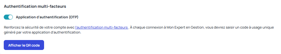 Scannez ce QR code avec votre mobile (appareil photo ou application d'authentification) pour configurer la clé de sécurité de Mon Expert en Gestion. Un code sera généré automatiquement toutes les 30 secondes. | ![]() |